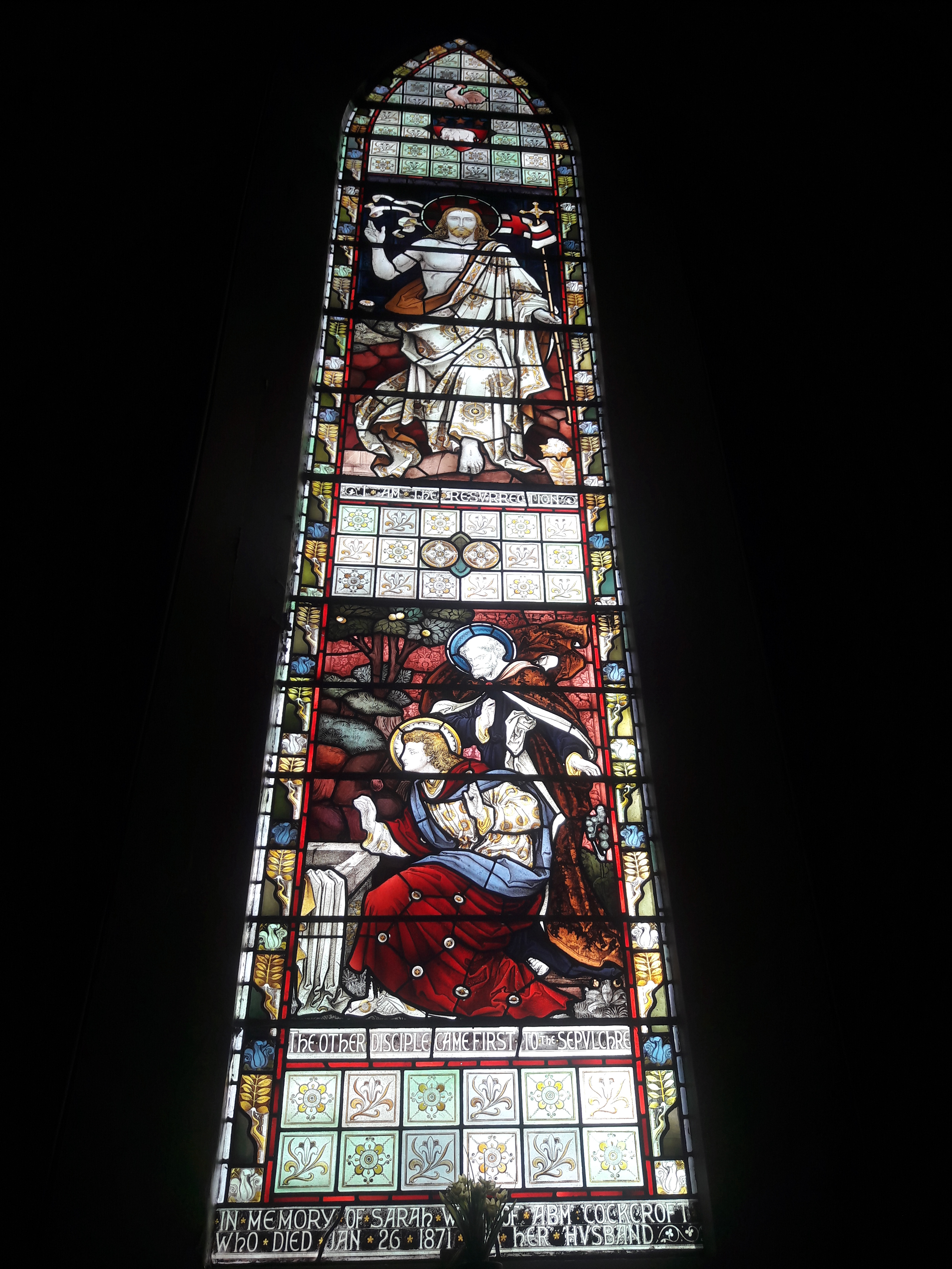 This window is in the East end. The Reverend George Sowden, who carefully led his flock through the upheavals in the Church of England at that time, described the blue robes of The Blessed Virgin Mary, as “ the best glass in our church”. And it is true what they said that the glass improves with familiarity. So visit, you are most welcome.